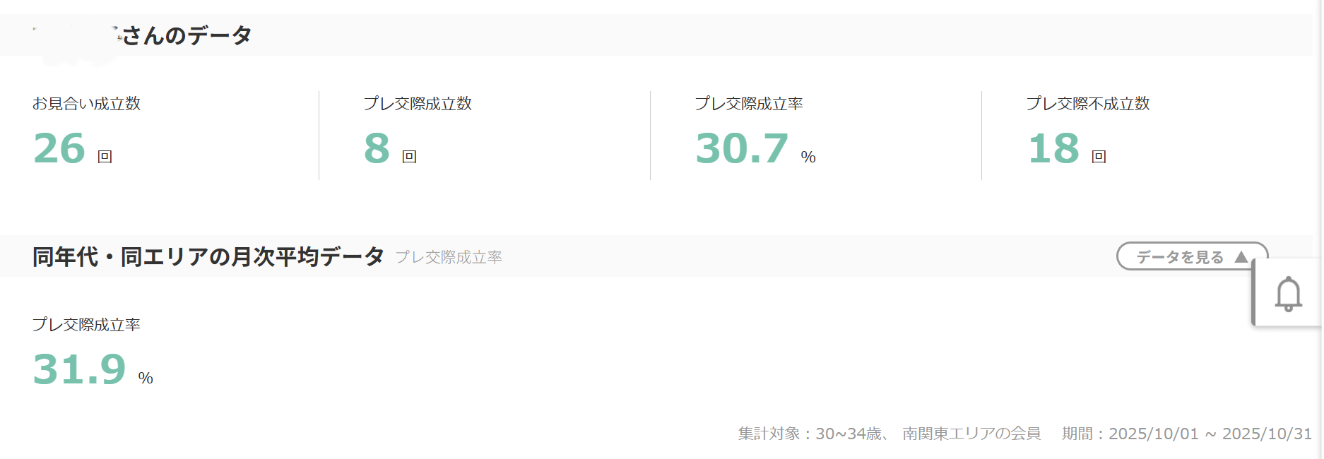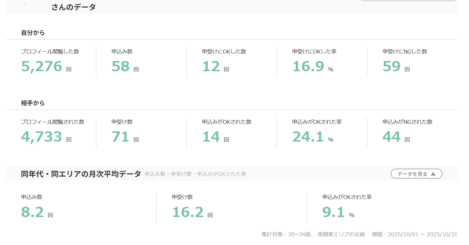 実際に里佳子さんの6か月間のデータを見ると、申込み数は「58回」、申受け数は「71回」となっています。自分から申し込むだけでなく、相手からの申し込みもしっかり受け入れ、両方からお見合いに繋げているんですね。
