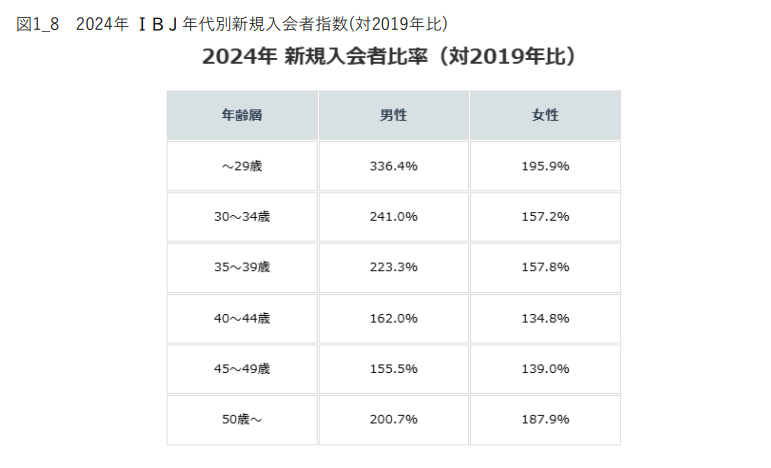 下記の表をご覧ください。IBJにおける20代男性の新規入会者数を2019年度と比較すると、2024年度は3倍以上に増えていることが分かります。また、2024年版「IBJ成婚白書」では、次のように述べられています。