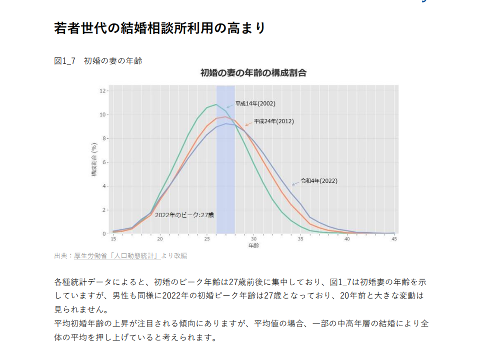 次に、こちらのグラフをご覧ください。2022年(令和4年)のデータになりますが、女性の初婚年齢は27歳が最も多いことが分かります。実はこの傾向は、男性にもほぼ同じことが言えます。
